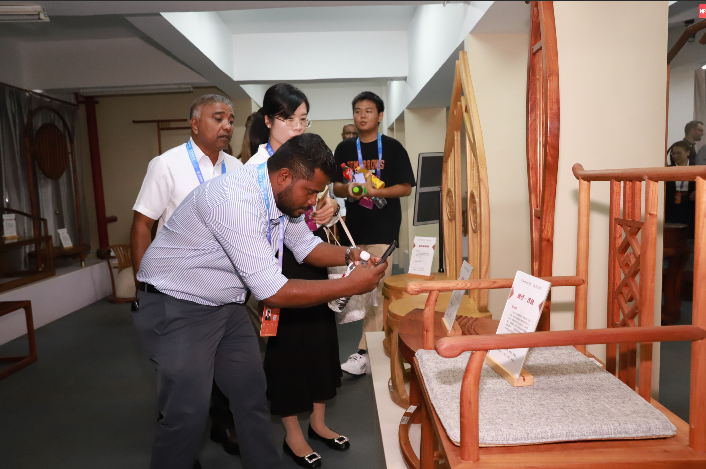 代表团首先参观了王建阳大师工作室,工作室里陈列的家具是王建阳带领我院家具团队结合传统木艺家具样式研发的新产品,每件作品都制作精美、款式新颖,吸引了代表团成员纷纷拍照留念。