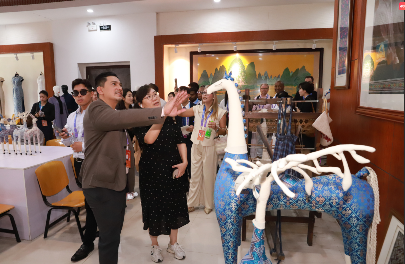 随后,代表团来到壮锦研究所参观壮锦传承人谭湘光的大师工作室。研究所里陈列着谭湘光教学团队指导学生结合现代工艺与需求设计研发的精美壮锦创新融合产品。代表团成员对传统壮锦工艺的精湛技艺和现代艺术创新的高度融合表示赞赏,并购买了一些壮锦产品留作纪念。