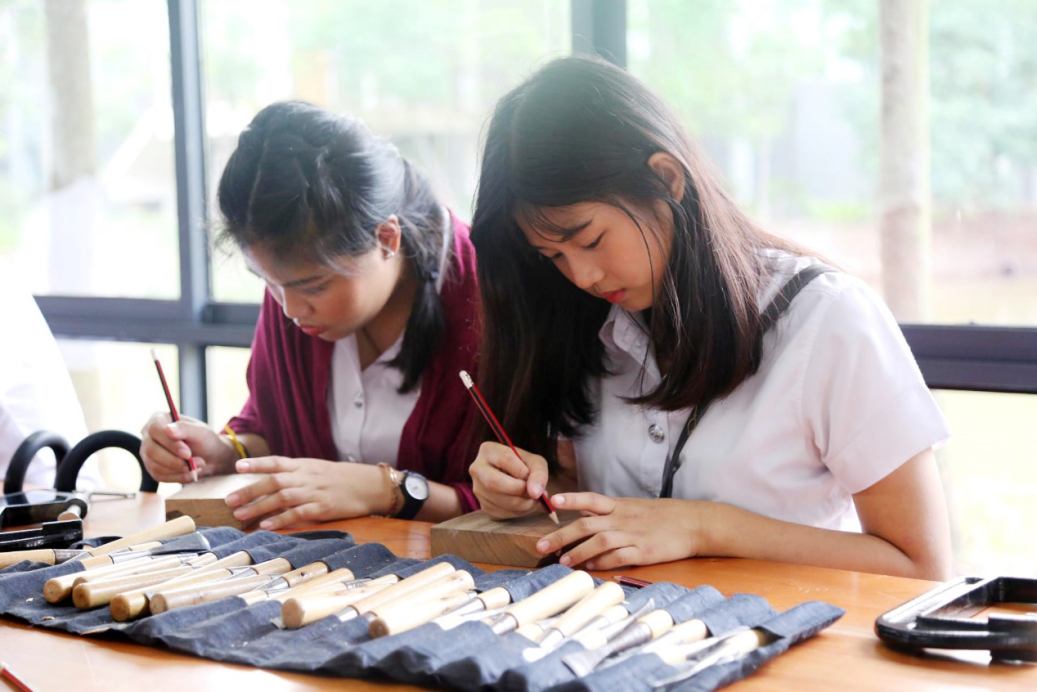 泰国帕那空皇家理工大学师生在家具艺术设计专业实训室认真学习木艺雕刻