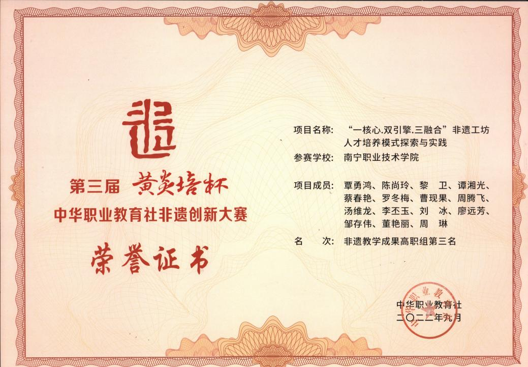第三届黄炎培杯中华职业教育社非遗创新大赛广西区赛获一等奖
